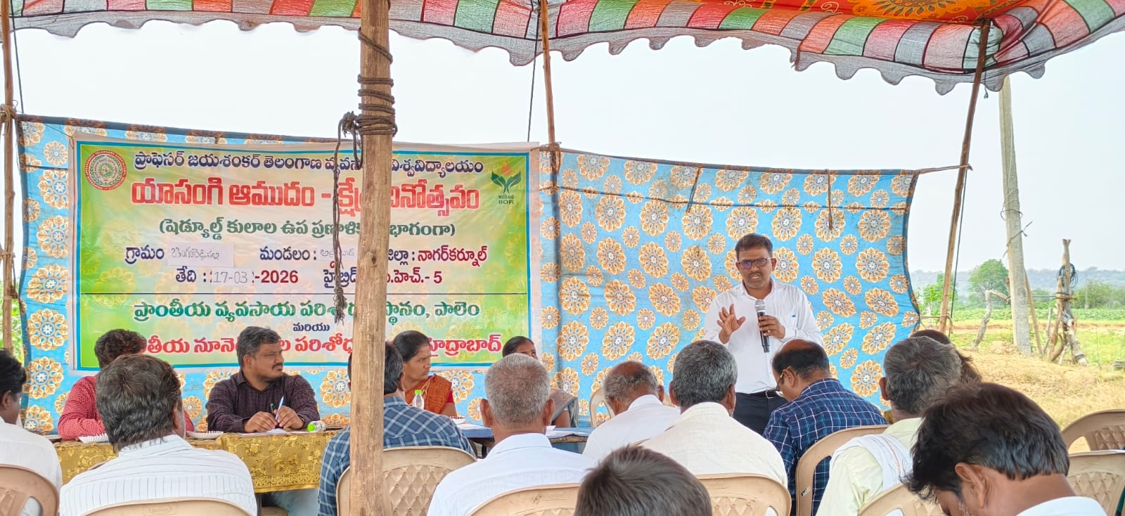 A field day was organized on 17th March, 2026 at Jangamreddypalli village, Amrabad mandal, Nagarkurnool district, as part of the “Praja Palana - Pragati Pranalika: 99 Days Action Plan” to promote rabi castor cultivation under the Scheduled Caste Sub-Plan (SC-SP). The programme aimed to enhance the area and productivity of rabi castor by demonstrating improved production technologies. The field day was conducted at the farmer’s field of Sri Ch. Niranjan, where the high-yielding castor hybrid ICH-5 was demonstrated. The programme focused on creating awareness among farmers regarding the adoption of improved technologies, particularly high-yielding cultivars, to increase productivity, profitability and area expansion under rabi castor cultivation. The event was organized by the team of scientists from AICRP on Castor, RARS, Palem, comprising Dr. K. Sadaiah, Scientist (Plant Breeding), Dr. M. Shankar, Scientist (Entomology), Mrs. K. Mamatha, Scientist (Agronomy) and Dr. G. Eswara Reddy, Scientist (Plant Breeding) along with Dr. M. Sreedhar, Principal Scientist (Oilseeds). The programme was conducted under the chairmanship of Dr. L. Krishna, Associate Director of Research, RARS, Palem. At the outset, Dr. K. Sadaiah highlighted the significance of the programme and emphasized the need to expand castor cultivation in the state. He also informed farmers about the availability of quality seed at RARS, Palem. The host farmer, Sri Ch. Niranjan shared his experiences and crop management practices adopted for raising a healthy crop. An interactive session followed, during which farmers raised queries related to best management practices, pest and disease management and marketing opportunities in castor. Addressing the gathering, Mrs. K. Mamatha elaborated on improved agronomic practices for achieving higher yields. Dr. M. Shankar discussed effective pest and disease management strategies while Dr. M. Sreedhar emphasized the importance of rabi castor cultivation under irrigated conditions and appreciated farmers for adopting the crop. Dr. L. Krishna highlighted the importance of traditional crops of the region and stressed the need for maintaining soil health and nutrient status to achieve sustainable yields. He also discussed various opportunities for farmers to get acquainted with the latest agricultural technologies. The programme concluded with a field visit to the ICH-5 demonstration plot, where farmers observed the crop performance and interacted with scientists regarding varietal traits, crop management, and pest control measures.