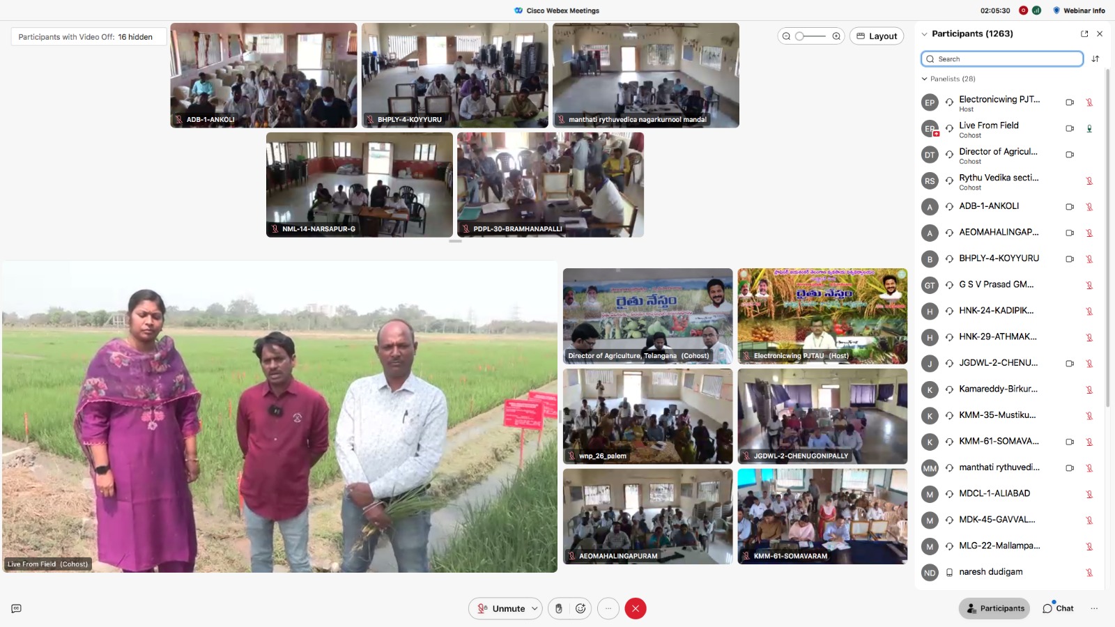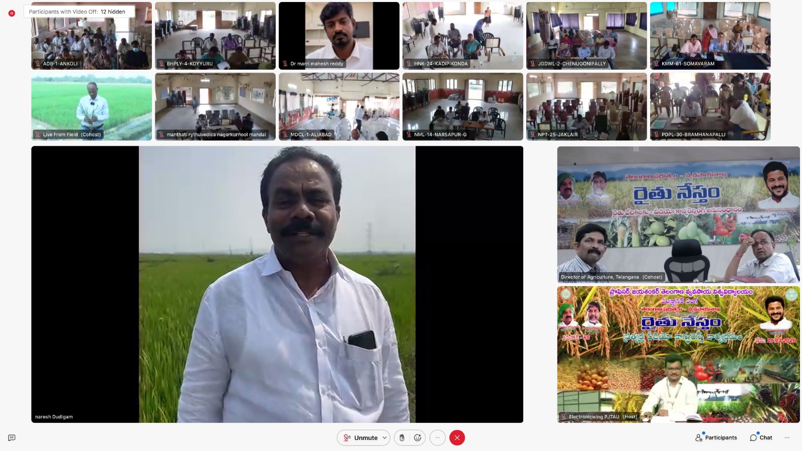 Rythu Nestham Live video conference 85th episode was conducted from Electronic Wing Studio at ARI, Rajendranagar on 10-03-2026 from 10 AM to 11-45 AM. The programme started with sharing of experiences by progressive farmer Sri.M.Venkata Reddy, Khammam District on Rice intercropping with Oil Palm. Dr.Mahesh Reddy MD,One Hospital created awareness on effects of Paraquat herbicide on human health. Sri.M. Prasad GM,TREDCO informed farmers about PM KUSUM project guidelines and advantages. Later Experts of Rice Research Unit Dr.Sridhar Siddi , Dr.Kiran Babu and Dr.Aruna Sri explaned about Rabi Rice crop management i.e Suphide Injury, Zn Deficiency, Stem rot ,Neck Blast and Stem borer control measures. The programme was presided by Dr. B. Gopi, Director of Agriculture, Dr. M.Sreenivasulu Principal Scientist (Agril.Extension) & Coordinator, Electronic Wing and officials from Directorate of Agriculture, officials of Agri and allied departments and about 39,000 farmers from 1582 Rythu Vedikas participated in the programme across the state.