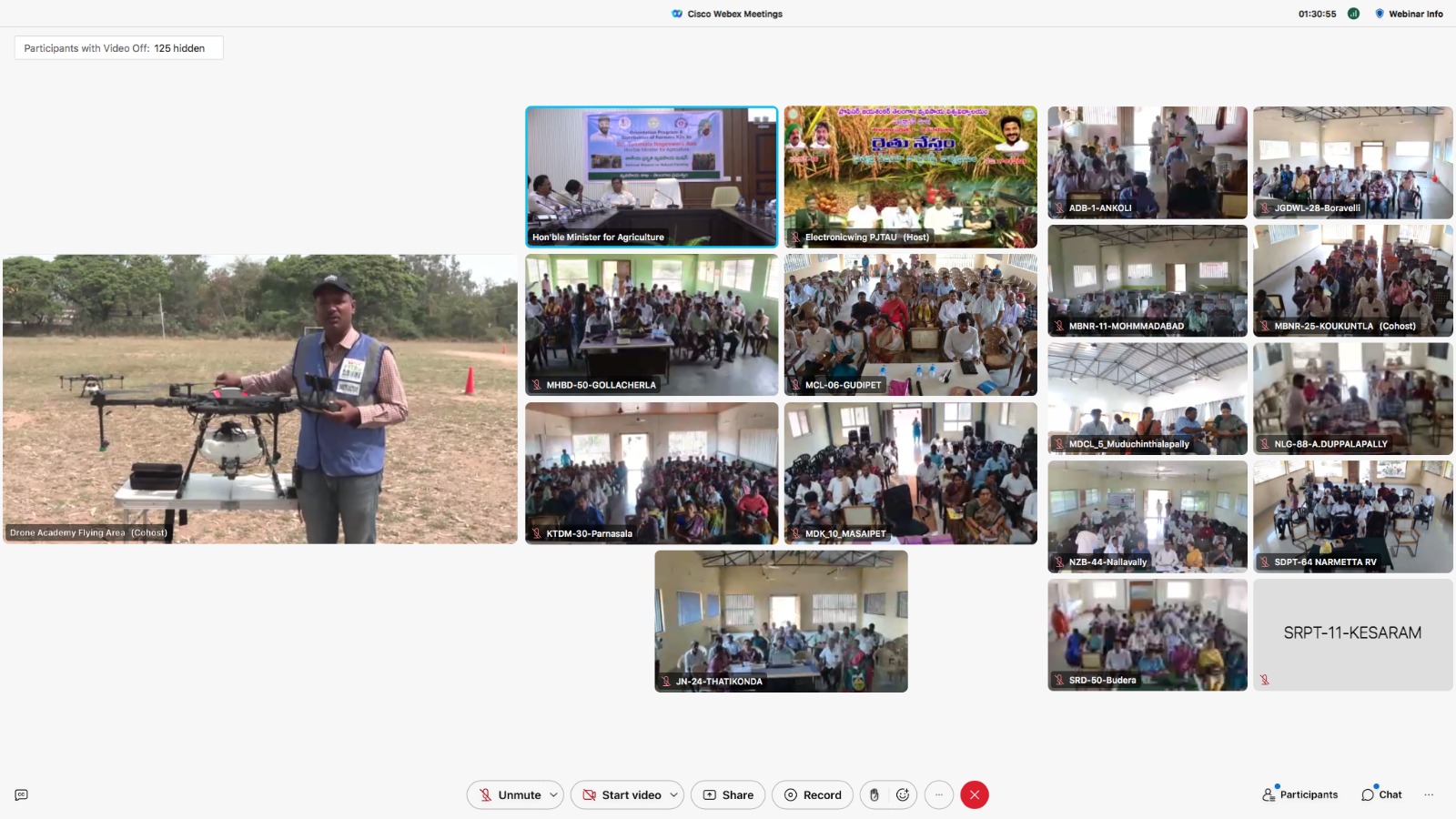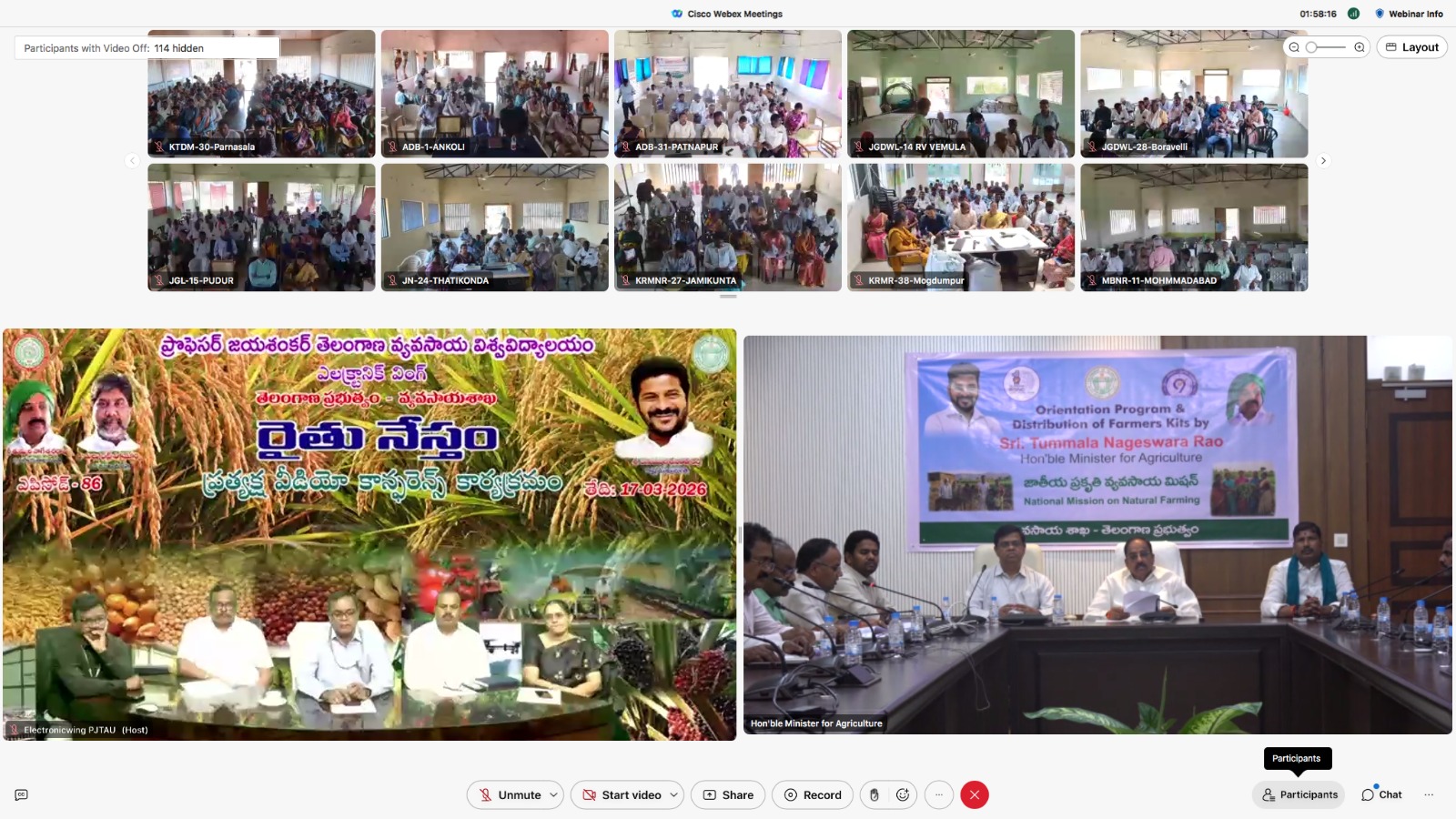 Rythu Nestham Live video conference 86th episode was conducted from Electronic Wing Studio at ARI, Rajendranagar on 17-03-2026 from 9.30 AM to 11-45 AM. Chief guest of the programme Sri. Tummala Nageshwara Rao, Hon’ble Minister for Agriculture in his introductory remarks stressed upon the need of adoption of natural Farming by the farmers to make chemical free cultivation. The programme started with sharing of experiences by progressive farmer Sri.Ch.Rama Rao, Koyachalaka (V), Raghunathapalem (M), Khammam District on Natural Farming, value addition and profitability he gained. Live from field Dr.T.Kiran Babu Scientist (Plant Pathology) and Drone Academy In-charge shared about advantages of drone technology and precautions to be taken up while handling drones for spray application of agricultural chemicals. Later in the session Dr. A.Madhavi, Principal Scientist and Head, Soil Health Management Centre, explained how to understand soil health card [SHC] details and management of fertilizers to the crops based on the SHC report. Interaction session of farmers with team of Scientists led by Dr.M. Balram, Director of Research. The programme was presided by Sri. K Surendra Mohan IAS, Secretary [Agril ] and.the programme , attended by Prof.Aldas Janaiah, Vice Chancellor PJTAU, Dr. B. Gopi , IAS, Director of Agriculture, Sri Anvesh Reddy, Chairman, TGSDC , Dr. M.Sreenivasulu Principal Scientist (Agril. Extension) & Coordinator, Electronic Wing and officials from Directorate of Agriculture, officials of Agri and allied departments and about 100,000 farmers from 1582 Rythu Vedikas participated in the programme across the state.