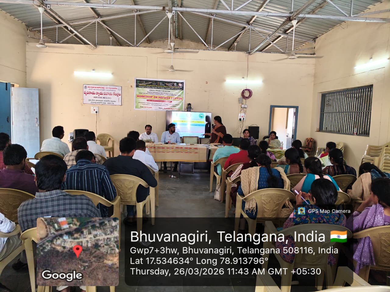A workshop on “High Density Planting System (HDPS) in Cotton” was organized on 26th March, 2026 at Masukunta village of Bhuvanagiri mandal, Yadadri Bhuvanagiri district, under the aegis of Professor Jayashankar Telangana State Agricultural University (PJTSAU) through the Telangana Rythu Vigyana Kendram (TRVK), as part of a special project of the Cotton Research Station. During the programme, Dr. D. Srilatha, Principal Scientist and Coordinator of TRVK, addressed the gathering and elaborated on the concept of High Density Cotton Cultivation, its advantages, and project details. She emphasized the need to expand this technology across the district and advised agricultural extension officers to promote it actively. She also informed that the Government of India is providing an incentive of ₹5,000 per acre directly to farmers adopting High Density Planting System under this project. District Agriculture Officer, Sri P. V. Ramana Reddy, highlighted that higher yields can be achieved through this method and encouraged farmers to adopt this system in the upcoming Kharif season as well. Dr. Y Prashanth, Scientist from Regional Agricultural Research Station, Warangal, explained crop management practices and pest management strategies under High Density Planting System. Assistant Director of Agriculture (ADA), Sri Venkateshwarlu, elaborated on the usage and benefits of the Cotton Shredder. ADA Smt. S. Neelima and ADA Smt. Shanti Nirmala from Yadagirigutta provided field-level implementation guidelines to agricultural extension officers for effective execution of this method. A large number of agricultural officers and extension personnel from Bhuvanagiri and Jangaon districts participated in the programme and expressed their readiness to implement this technology effectively at the field level