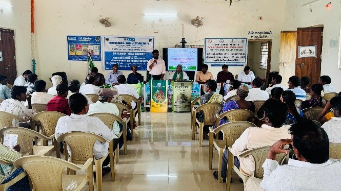 Krishi Vigyan Kendra, Bhadradri Kothagudem organized an awareness programme on fermented organic manure in coordination with Fertilizer and Chemicals Travancore Ltd. (FACT) at Rythu Vedika, Jaganadhapuram Cluster, Mulakalapally, Mandal, Bhadradri Kothagudem District on 11.03.2026. During the programme, Dr. T. Bharath, Programme Coordinator explained the importance of fermented organic manure for improving soil health and sustainable agriculture. He also delivered a lecture under Agricultural Technology Management Agency (ATMA) on the importance of suitable paddy varieties, natural farming, integrated farming system, nano fertilizers and climate-resilient agricultural technologies for farmers. Dr. N. Hema Sarat Chandra, SMS (Extension), briefed the participants about the formation and importance of Farmer Producer Organizations (FPOs) and market-led extension for improving farmers’ income. Sri. B. Shiva, SMS(Horticulture), explained Integrated Crop Management practices in mango, oil palm, and vegetable crops. The programme was attended by Sri. S. Veera Bhadradro, Chairman ATMA, Sri. Ravikumar, Assistant Director of Agriculture, Sri. Rammohan, General Manager, FACT, Sri. Arunkumar, Agriculture Officer, AEOs, village Sarpanches, and about 100 farmers from the cluster.