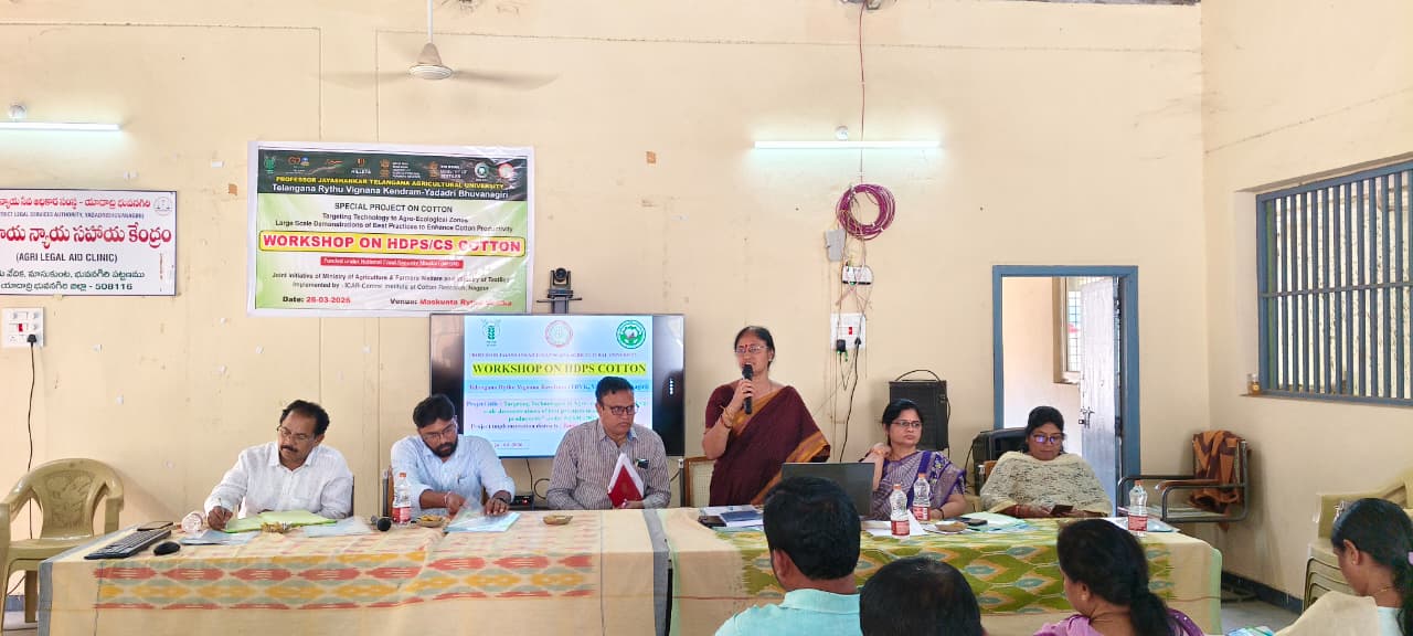 A workshop on “High Density Planting System (HDPS) in Cotton” was organized on 26th March, 2026 at Masukunta village of Bhuvanagiri mandal, Yadadri Bhuvanagiri district, under the aegis of Professor Jayashankar Telangana State Agricultural University (PJTSAU) through the Telangana Rythu Vigyana Kendram (TRVK), as part of a special project of the Cotton Research Station. During the programme, Dr. D. Srilatha, Principal Scientist and Coordinator of TRVK, addressed the gathering and elaborated on the concept of High Density Cotton Cultivation, its advantages, and project details. She emphasized the need to expand this technology across the district and advised agricultural extension officers to promote it actively. She also informed that the Government of India is providing an incentive of ₹5,000 per acre directly to farmers adopting High Density Planting System under this project. District Agriculture Officer, Sri P. V. Ramana Reddy, highlighted that higher yields can be achieved through this method and encouraged farmers to adopt this system in the upcoming Kharif season as well. Dr. Y Prashanth, Scientist from Regional Agricultural Research Station, Warangal, explained crop management practices and pest management strategies under High Density Planting System. Assistant Director of Agriculture (ADA), Sri Venkateshwarlu, elaborated on the usage and benefits of the Cotton Shredder. ADA Smt. S. Neelima and ADA Smt. Shanti Nirmala from Yadagirigutta provided field-level implementation guidelines to agricultural extension officers for effective execution of this method. A large number of agricultural officers and extension personnel from Bhuvanagiri and Jangaon districts participated in the programme and expressed their readiness to implement this technology effectively at the field level